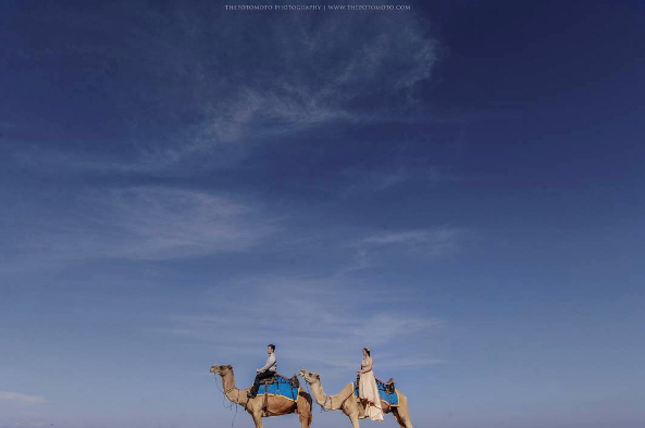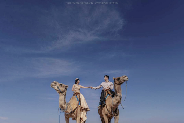 Resort mewah ini menawarkan keunikan tersendiri untuk kamu jadikan sebagai lokasi prewedding, yaitu karena keberadaan unta-untanya. Kamu bisa berpose sambil menunggangi unta atau kalau kamu tidak berani naik keatasnya kamu bisa berpose sambil diapit sepasang unta sebagai pendamping.