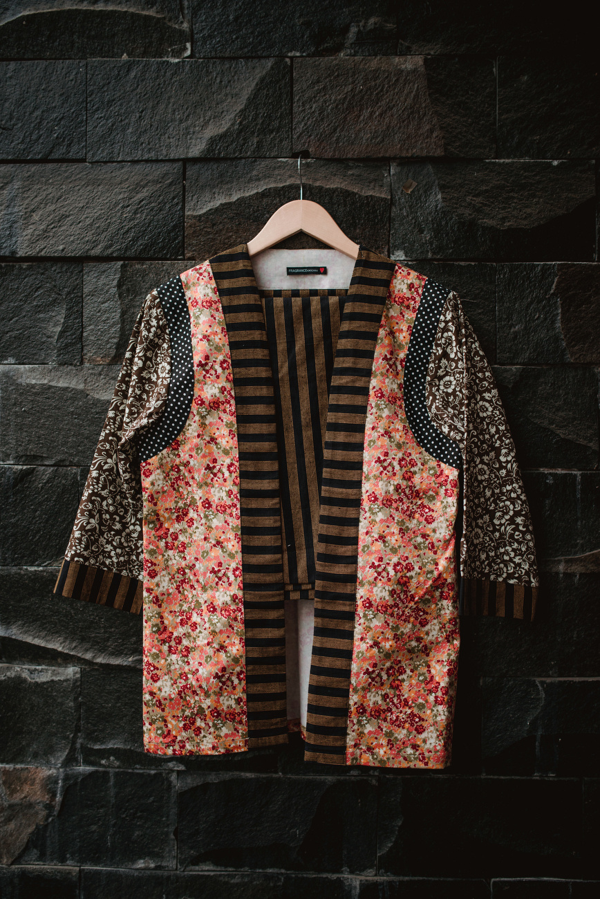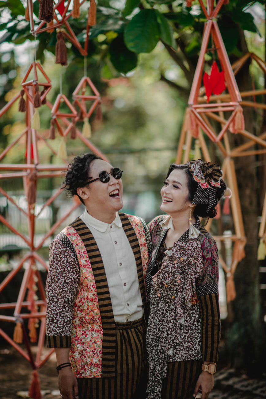 Sejak awal Fina dan Agi sudah punya gambaran kalau mereka ngga akan mengenakan gaun dan jas karena konsep pernikahan outdoor mereka yang santai. Jadi mereka sama-sama mengenakan baju casual yang serasi dengan paduan motif batik, bunga, dan polkadot.