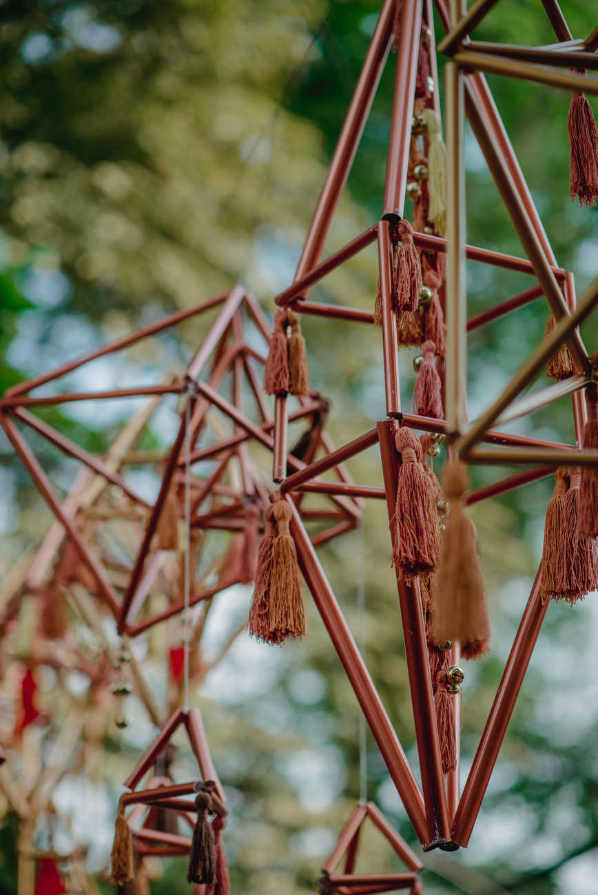 Tema Eleknik ini berhasil terasa karena dipadukan dengan detil ornamen konsep etnik dari unsur kayu dan kain batik. Agar lebih terkesan modern dan sentuhan elektrik, Menjalin memberikan sentuhan modern lewat hanging geometric berwarna senada. Keseluruhannya sangat menyatu dengan color palette coklat, oranye, merah, dan kuning.