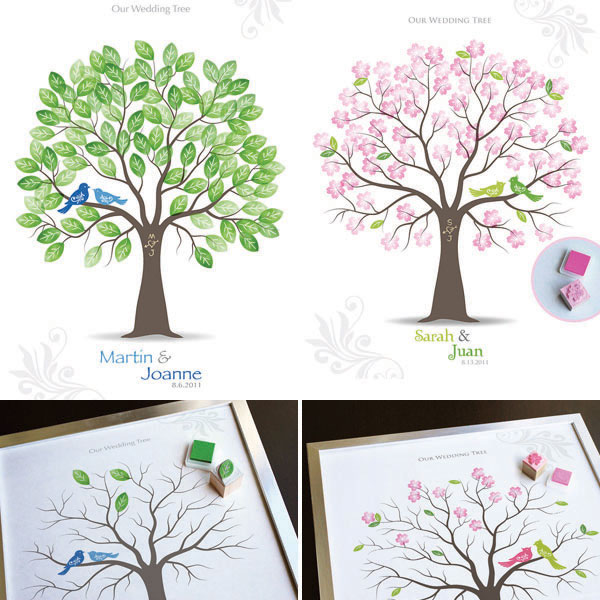 Kalau kamu khawatir para tamu tidak mau tangannya kotor karena tinta. Kamu bisa mencoba ide stamp ini. Konsepnya hampir sama dengan Thumbprint, bedanya kamu telah menyiapkan gambar pohon beserta stamp motif daun atau bunga. Jadi tamu undangan kamu cukup menulis nama mereka di cetakan daun atau bunga yang telah tersedia.