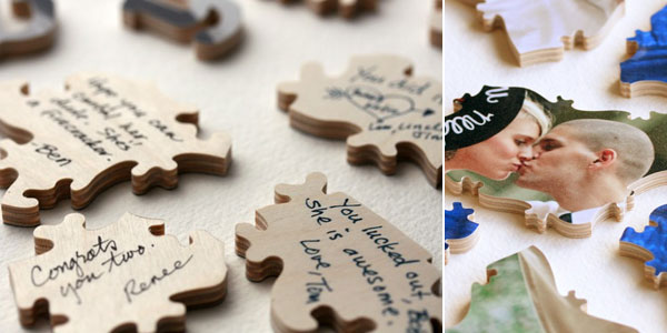 Wedding guest book ini sangatlah seru. Pilih foto favorit kamu bersama pasangan, bisa dipilih dari foto prewedding kalian. Lalu print dan potonglah menjadi bentuk-bentuk puzzle, sisi belakangnya bisa digunakan untuk para tamu menuliskan wish serta nama mereka.