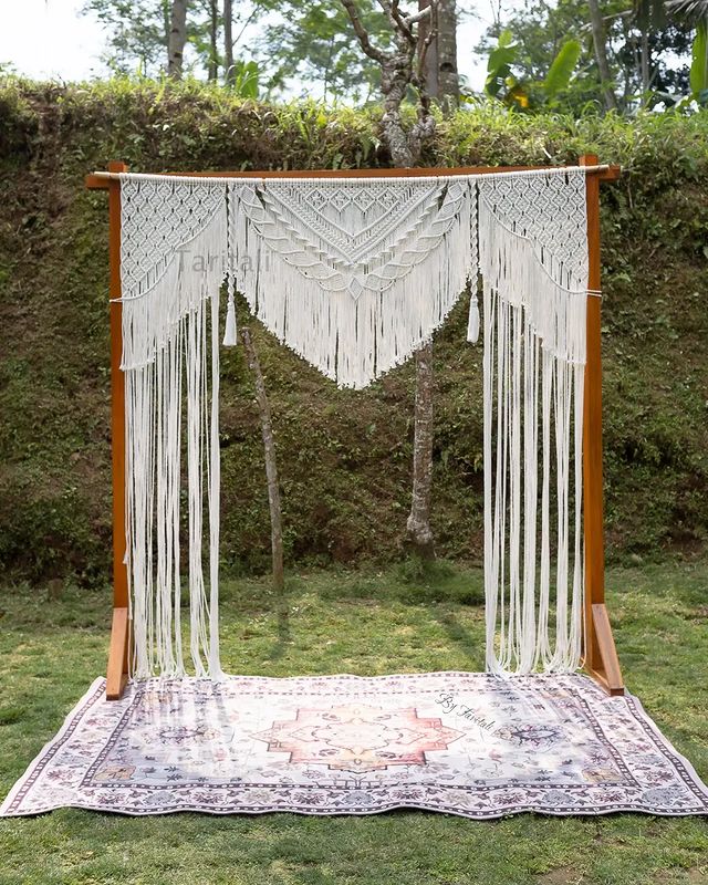 Pelaminan merupakan hal yang tidak bisa lepas dari dekorasi pernikahan murah. Banyak ide konsep yang bisa kamu tiru dalam mempersiapkan pelaminanmu. Kamu bisa mencoba menggunakan konsep pelaminan sederhana gaya vintage dengan hiasan tirai dan macrame, hal ini tentu akan mengurangi budget dekorasi pernikahan murah yang akan kamu keluarkan.